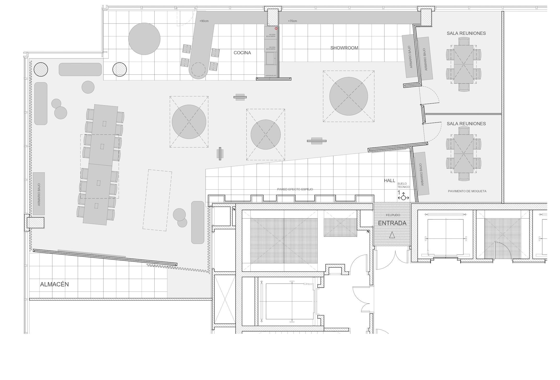 La intervención se completa con el diseño de piezas de iluminación y mobiliario expositivo.
