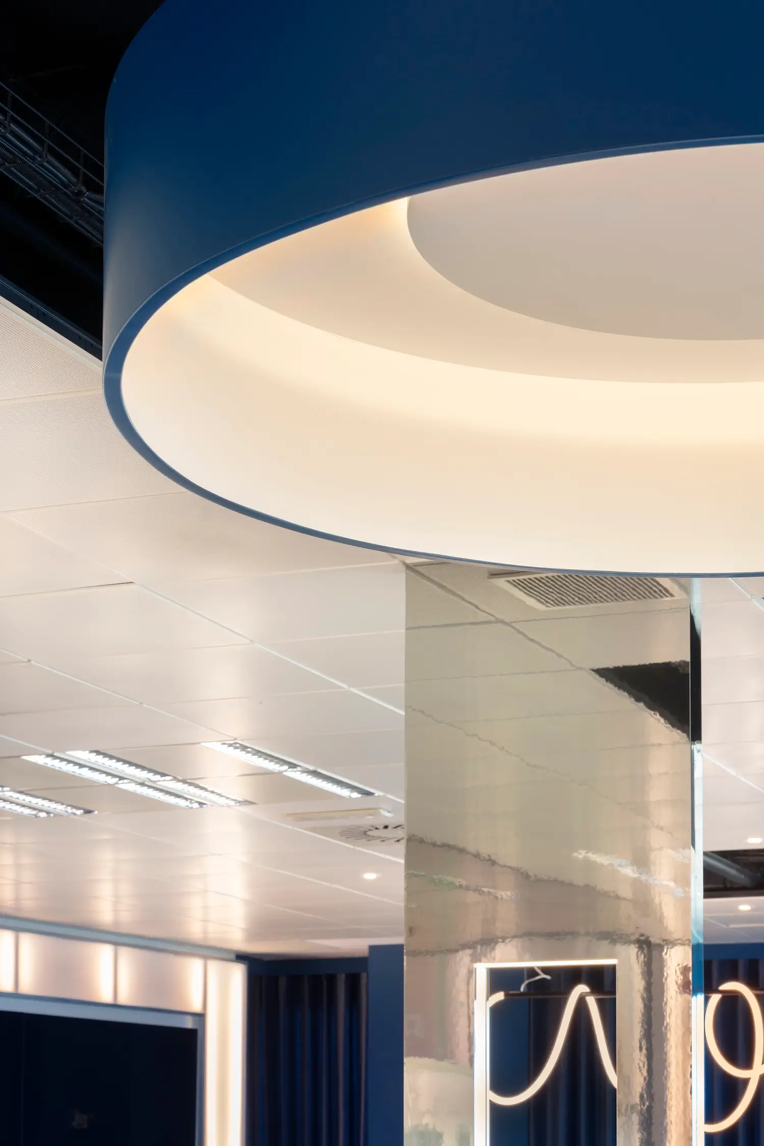 El predominante color azul hace referencia a la imagen de marca y abraza la cromática del mar presente en cada punto del espacio. De manera complementaria se ha realizado una selección de materiales que aporten modernidad al conjunto y sirvan de lienzo para la exposición de los productos de la marca. Paredes de policarbonato retroiluminadas, paredes revestidas de espejo y pavimento que combina zonas de acero galvanizado con moqueta azul organizan y jerarquizan las necesidades programáticas del proyecto.
